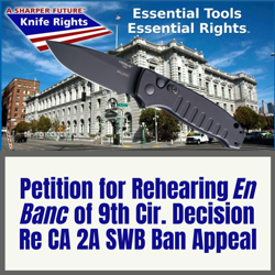Knife Rights and its fellow appellants have filed a petition for rehearing En Banc (the full court) of the twisted decision by the Ninth Circuit Panel in their lawsuit challenging California’s ban on switchblade (automatic) knives with a blade 2 inches and greater on Second Amendment grounds.