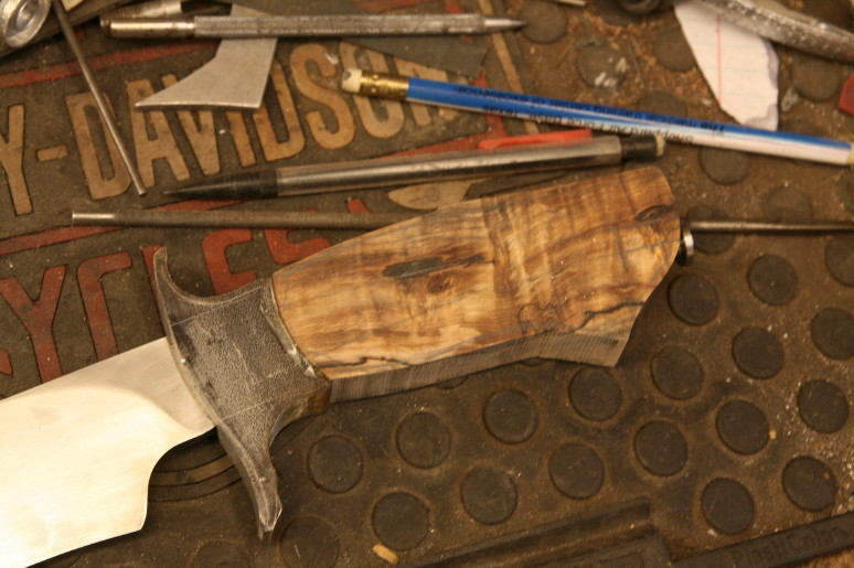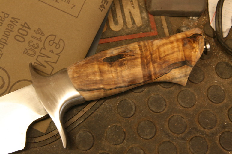 Here you can see that the guard is to its final shape. The handle is also ground to a near finished size. Next the finish will be laid down on the guard and sent off to the engraver. The handle and blade will be carved. By the time the fittings return the knife will be ready to assemble. The knife is held together by the threaded finial at the butt. This will be engraved along with a matching frog stud for the sheath. The parts are on the way to the engraver.